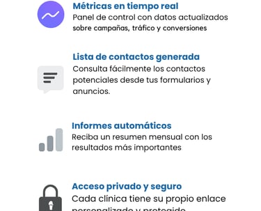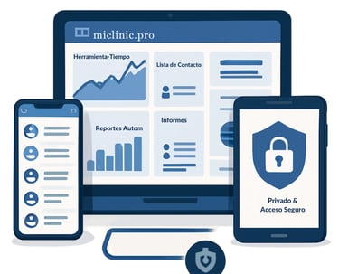 En MiClinic.Pro cada clínica accede a un panel privado donde puede consultar visitas, formularios recibidos, clics en WhatsApp y rendimiento de campañas, todo en tiempo real.
