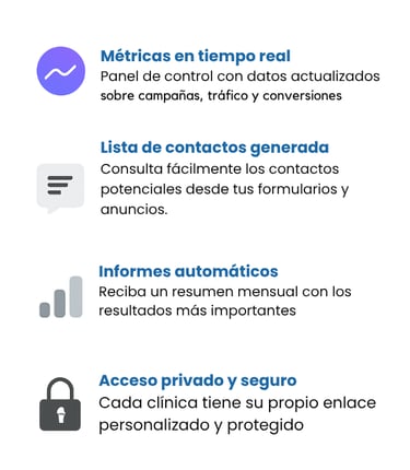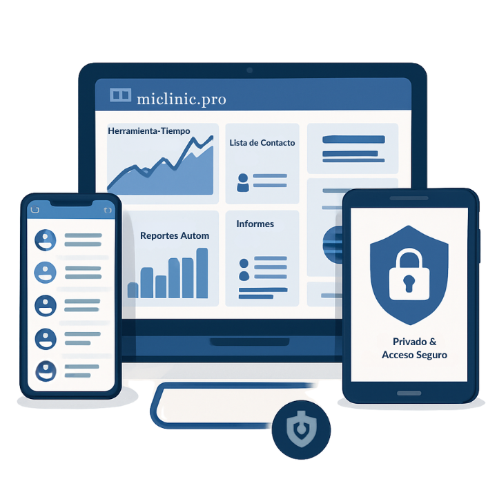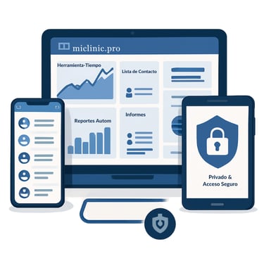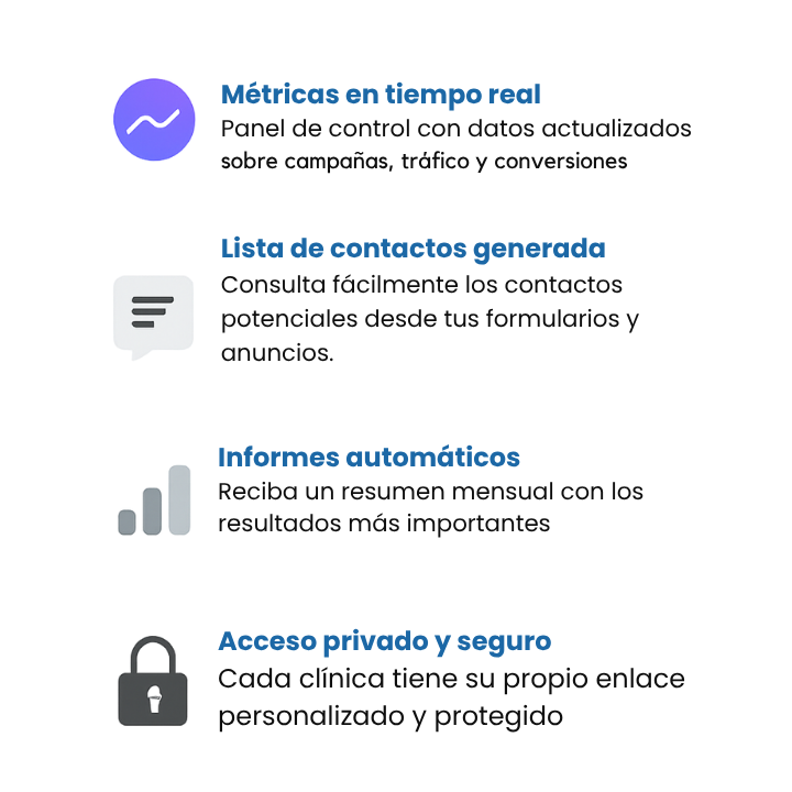 En MiClinic.Pro cada clínica accede a un panel privado donde puede consultar visitas, formularios recibidos, clics en WhatsApp y rendimiento de campañas, todo en tiempo real.
